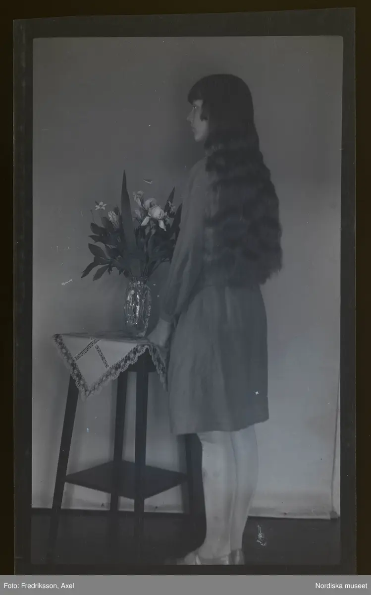 Frida Anna Elisabeth (kallad Anna-Lisa) Fredriksson, med midjelångt hår, står med ryggen mot kameran.