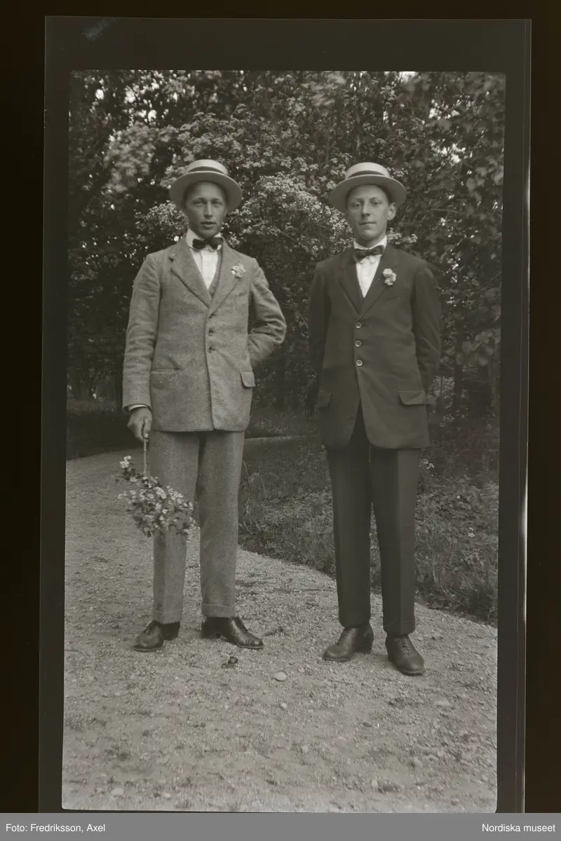 Porträtt av två unga män iklädda kostym och stråhattar, båda med blomma i kavajslaget. Den ene håller en blommande kvist.