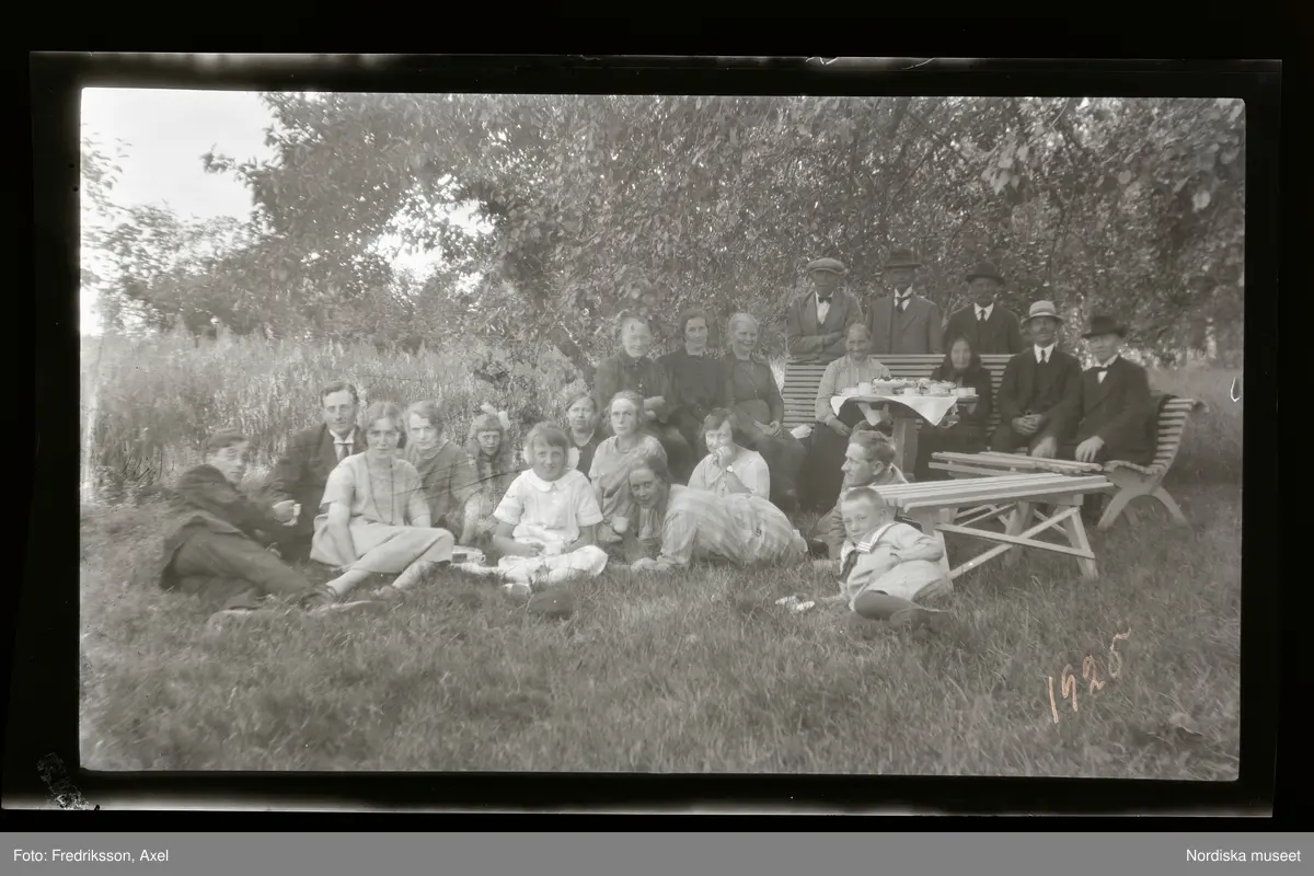 Grupporträtt av ett sällskap ute i en trädgård. Några sitter i gräset, andra sitter på trädgårdsbänkar kring ett bord dukat med kaffe och kakor.