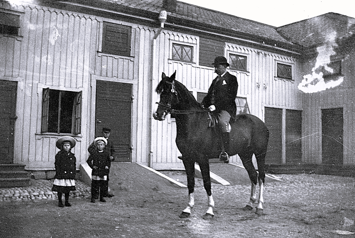 Titel: Foto av man som sitter på en häst samt barn som tittar på. Bildtext i album: "Pappa på hästen Lord".