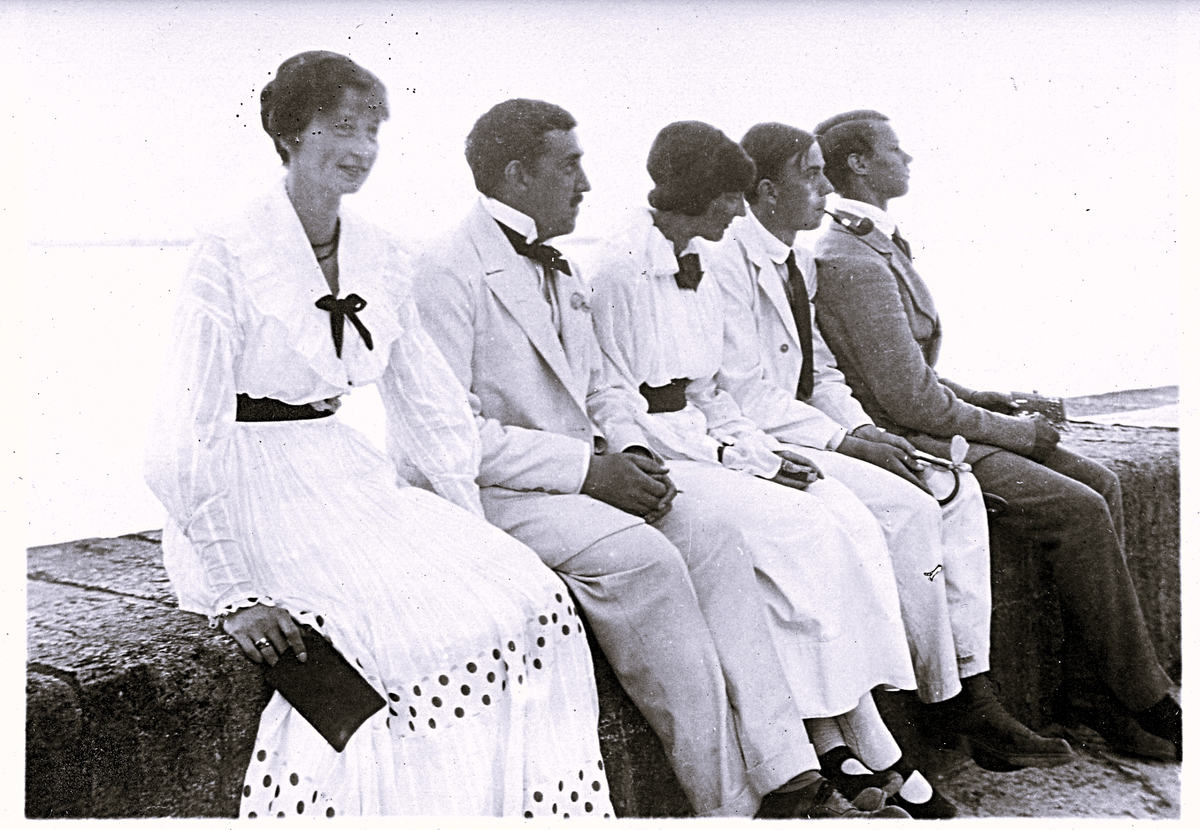 Titel: Foto av Ingrid Welander (f. Lagerholm) samt kvinnor och män sittandes på en pir. Bildtext i album: "På Gränna hamnpir 1916".
