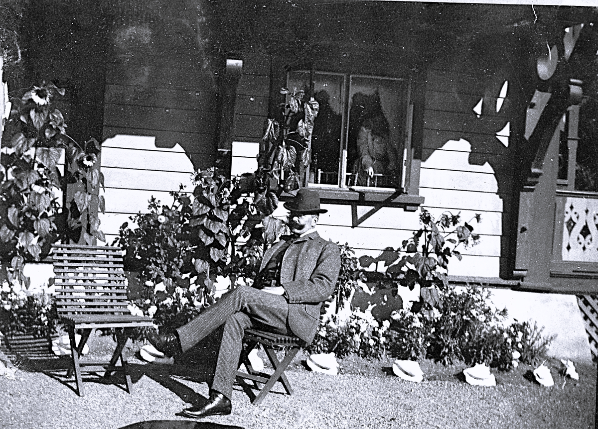 Foto av man som sitter framför huset, Gröndal. Bildtext i album: "Pappa".