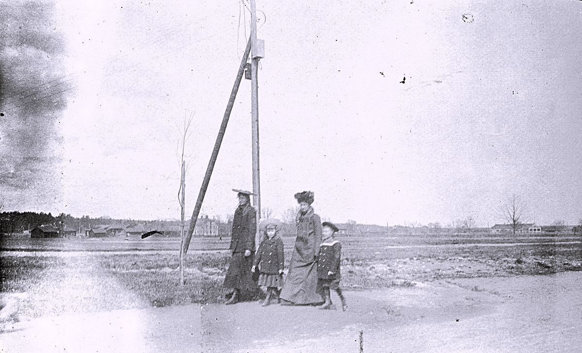 Foto av två kvinnor och två barn på promenad längs en väg.
