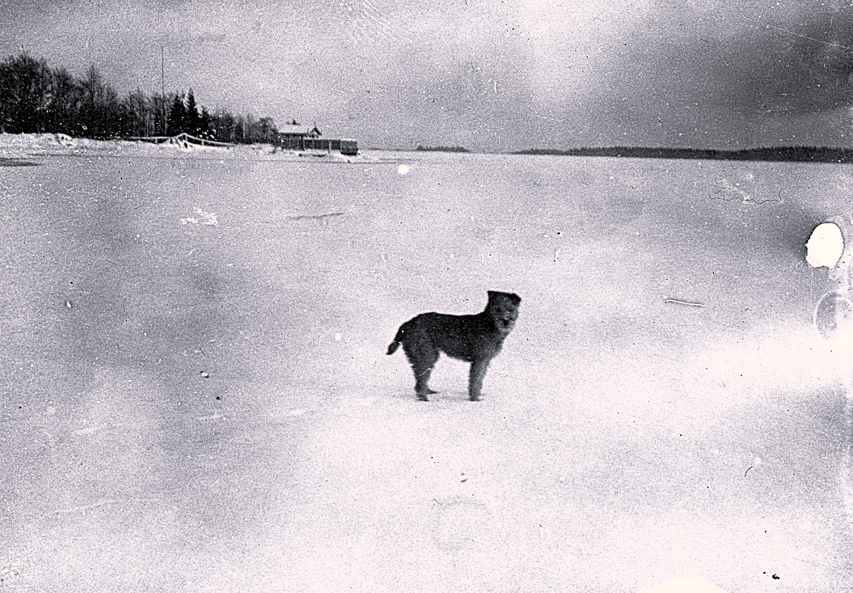 Foto av en hund ute på en snötäckt havsvik. Bildtext i album: "Hobbys första vinter 1903".