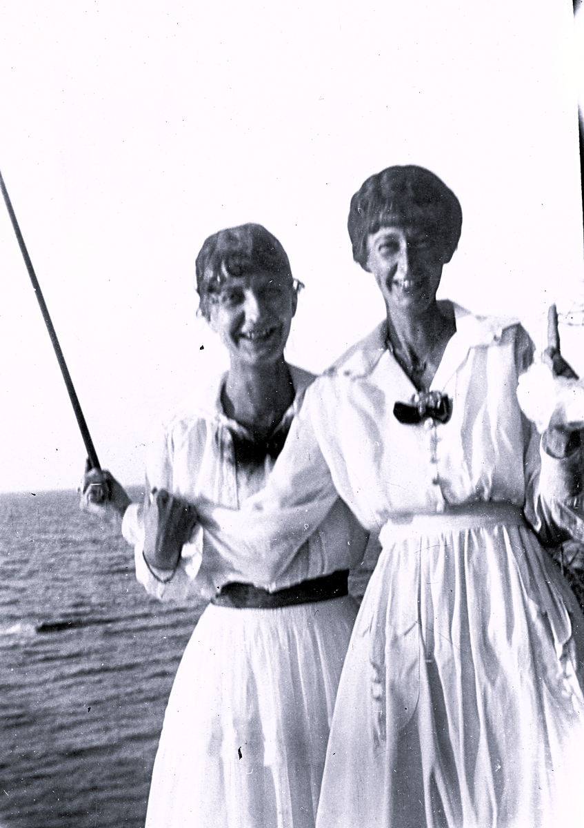 Foto av Ingrid Welander (f. Lagerholm) och väninna. Bildtext i album: "Två kattungar! Kneippbyn, Gotland".