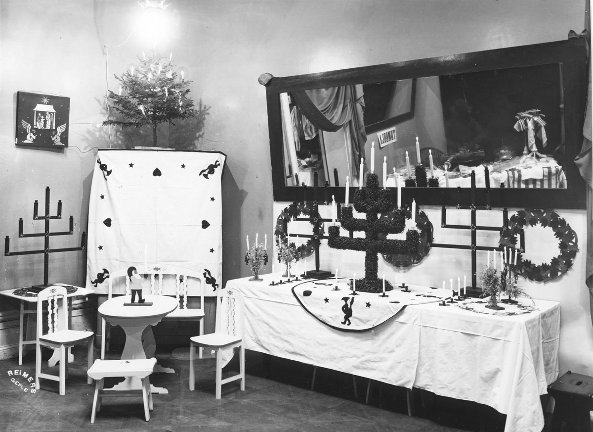 Elevarbeten från Gävle Stads Arbetsstuga för barn Nr 2, på Södra Kungsgatan 31 i Gävle. Arbetsstugor inrättades för att håll främst fattigare barn sysselsatta med nyttigt arbete efter skoldagens slut.