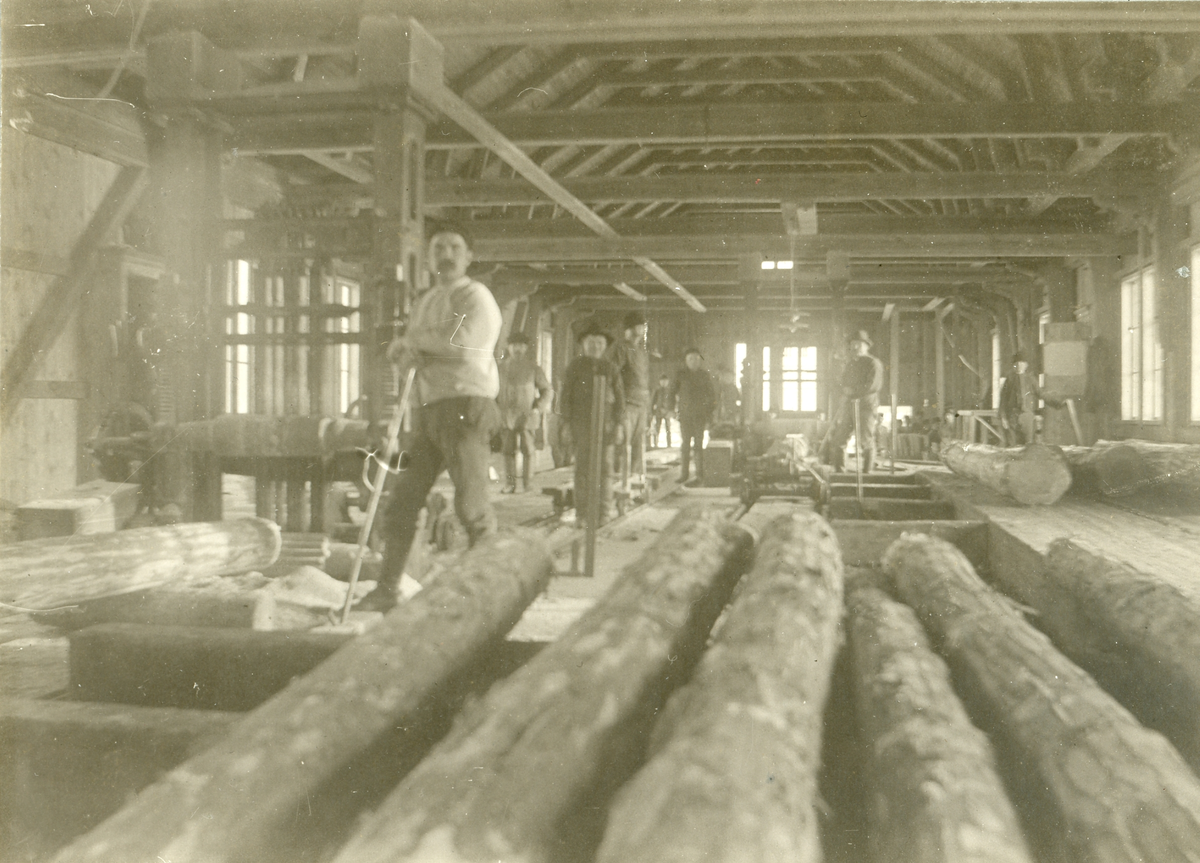 Foto inifrån en sågverksbyggnad med män som jobbar med timmerstockar.
