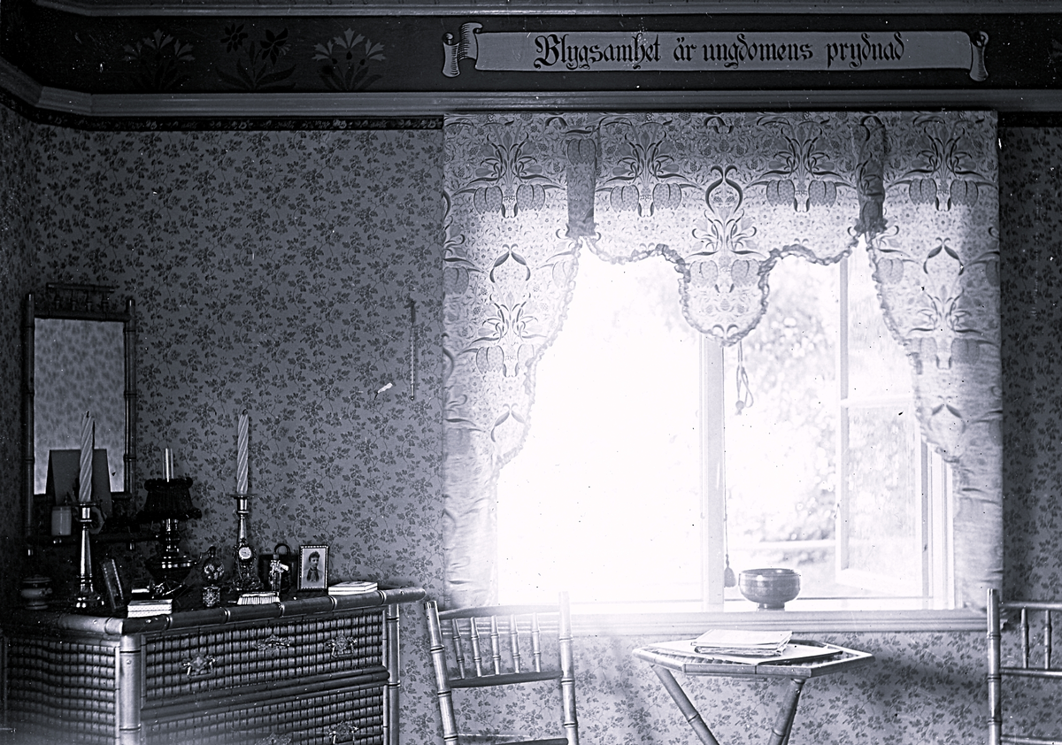 Foto inifrån ett rum på Gröndal med ett ordspråk tapetserat på väggen.