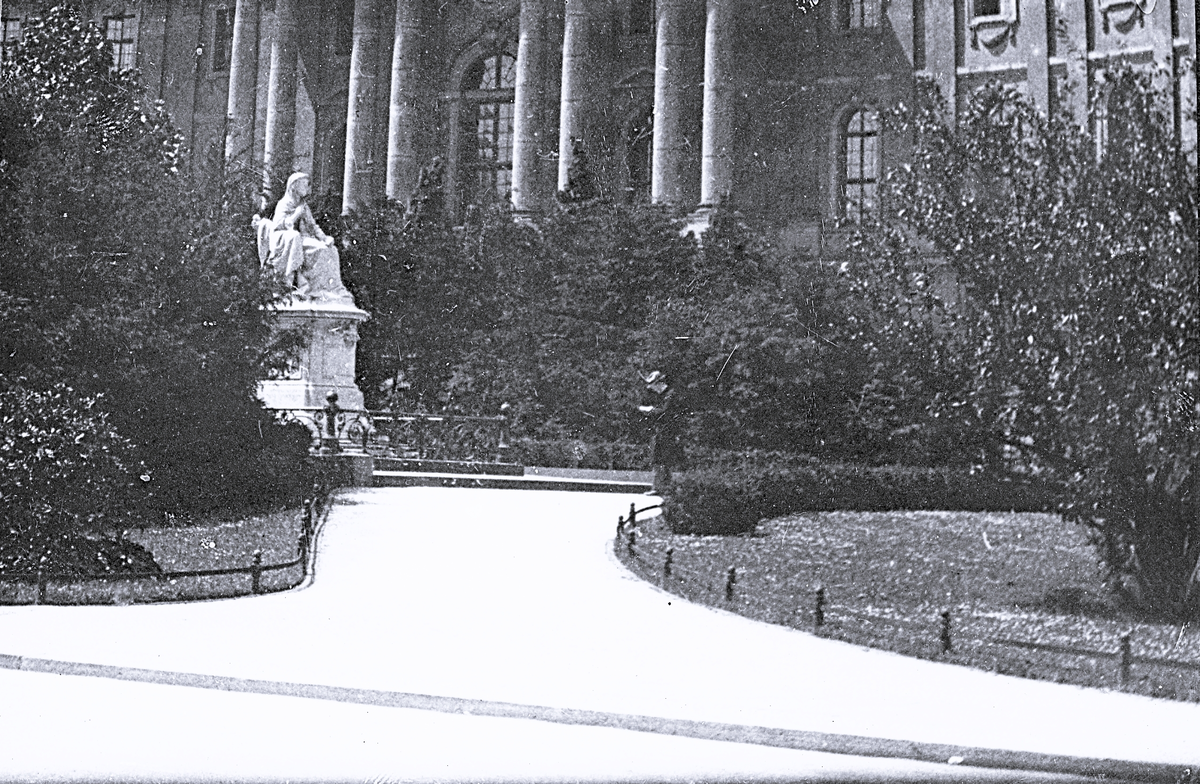 Foto av en staty föreställande en sittande kvinna omgiven av buskar och grönska i en park. Bakgrunden visar delar av en stor byggnad med tydliga arkitektoniska detaljer som pelare och fönster.