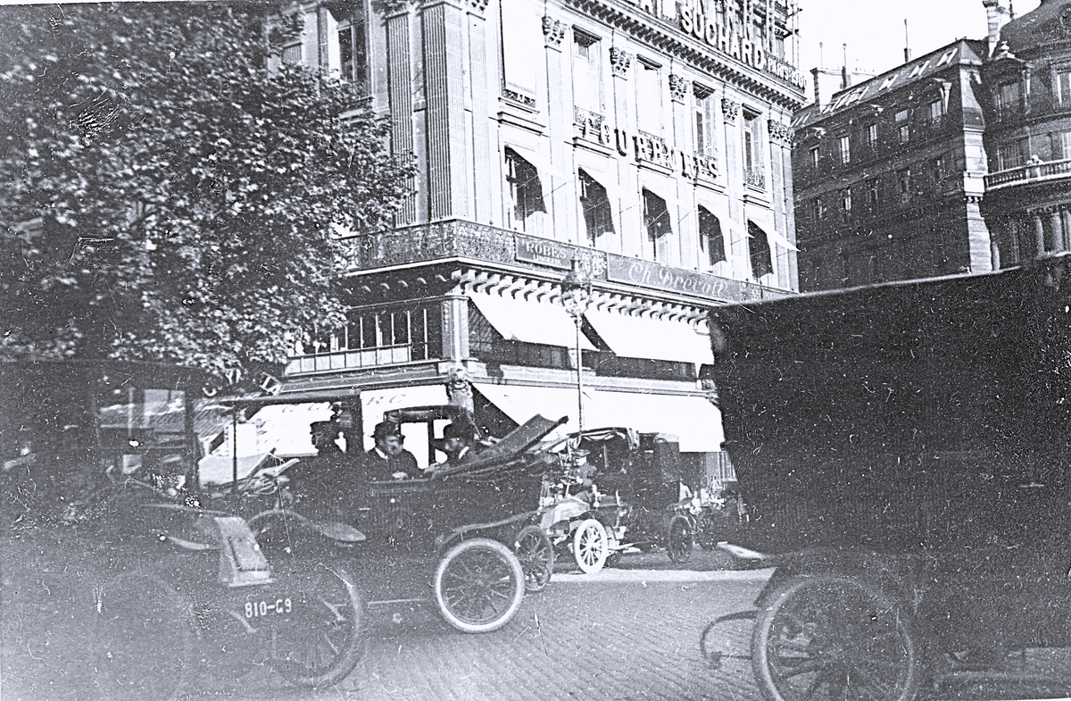 Fotot visar en gatuscen från Paris med en tidig bil och en hästdragen vagn framför en byggnad med texten "SUCHARD" synlig på fasaden, 1921.