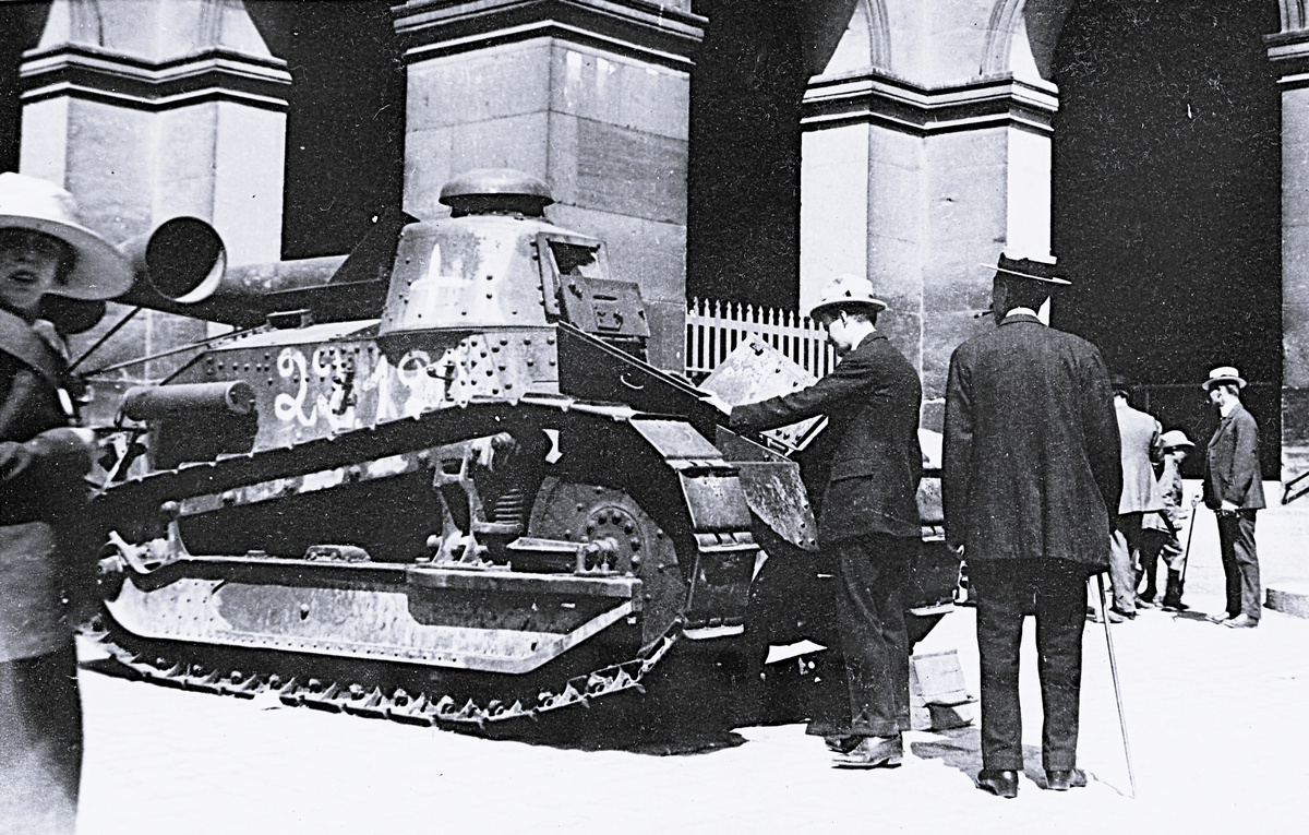 Titel: Foto av en stridsvagn, troligen på Musée de lÁrmée i Paris, 1921.
