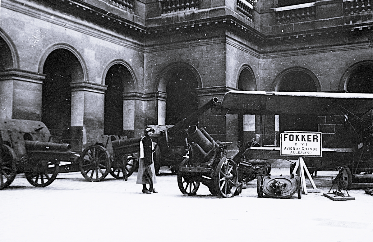 Titel: Foto av artilleripjäser och ett jaktflygplan - Fokker D.VII, från första världskriget, troligen på Musée de lÁrmée i Paris, 1921.