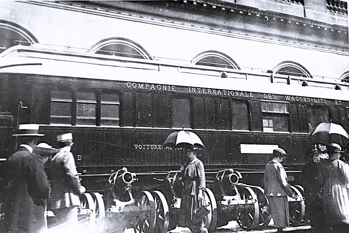 Titel: Foto av en historisk järnvägsvagn från "Compagnie Internationale des Wagons-Lits et des Grands Express Européens" ett lyxigt tåg med sovvagnar och restaurangvagnar, Paris 1921.