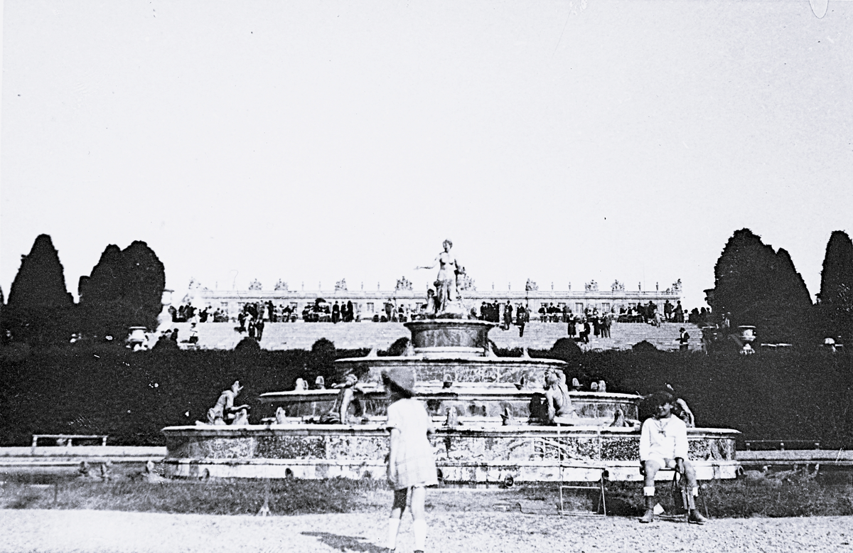 Foto av slottet Versailles i Frankrike med en fontän i förgrunden, 1921.