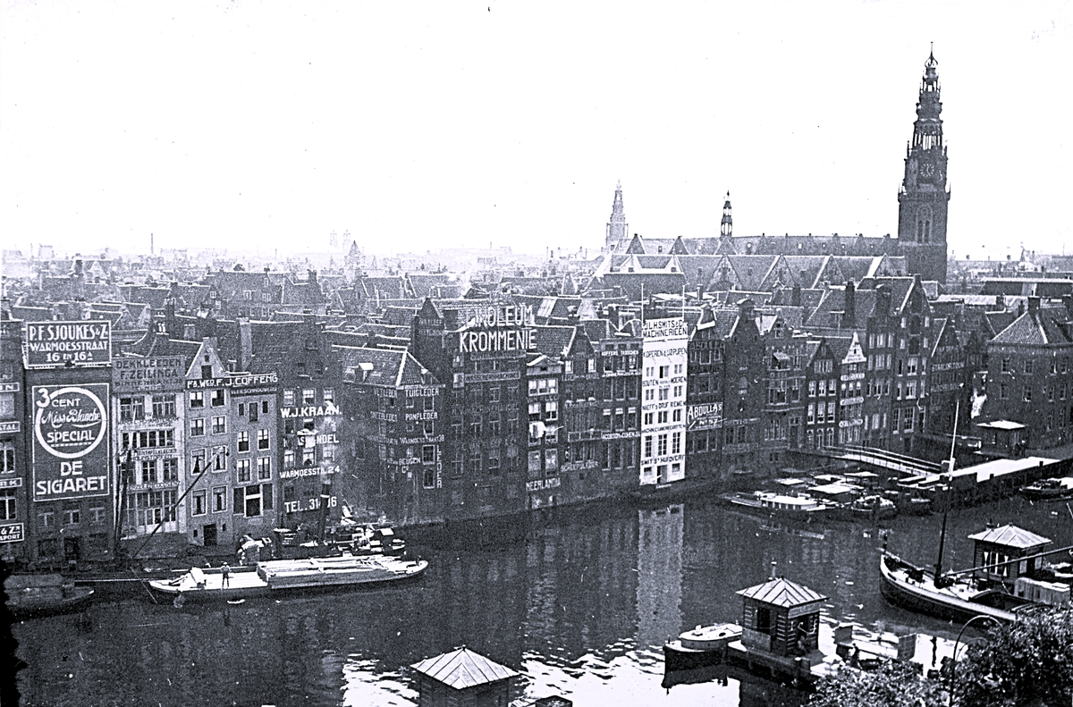 Vy över en kanalstad, troligen Amsterdam i Nederländerna, med flera byggnader längs vattnet och båtar i kanalen, 1924.