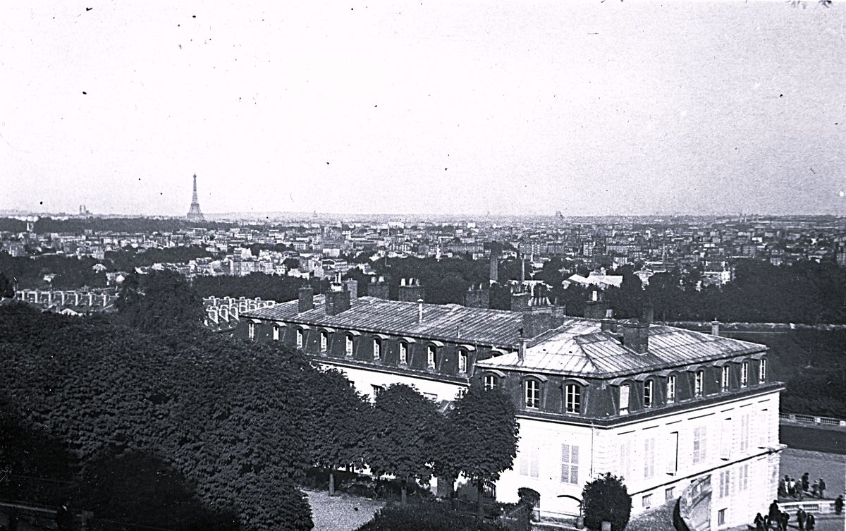 Titel: Vy över staden Paris med eiffeltornet långt bort i bakgrunden, 1924-25.