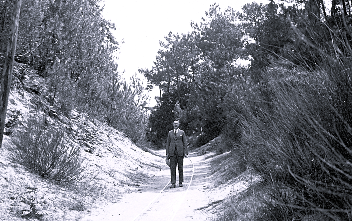 Titel: Foto av tandläkare Gunnar Högberg stående på en stig, som ser ut att ha en räls, omgiven av träd och buskar, någonstans vid franska atlantkusten, 1924-25.