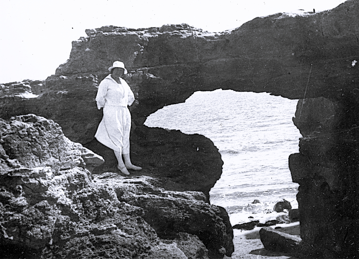 Foto av en kvinna som står vid en klippformation vid vattnet, troligen någonstans på franska atlantkusten, 1924-25.