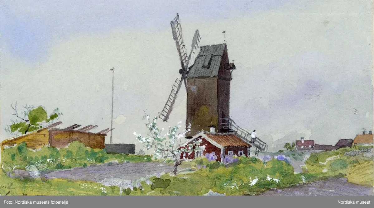 Akvarell av A T Gellerstedt. Sommarlandskap med kvarn och låga byggnader. "vid Grefgatan A.T.G."