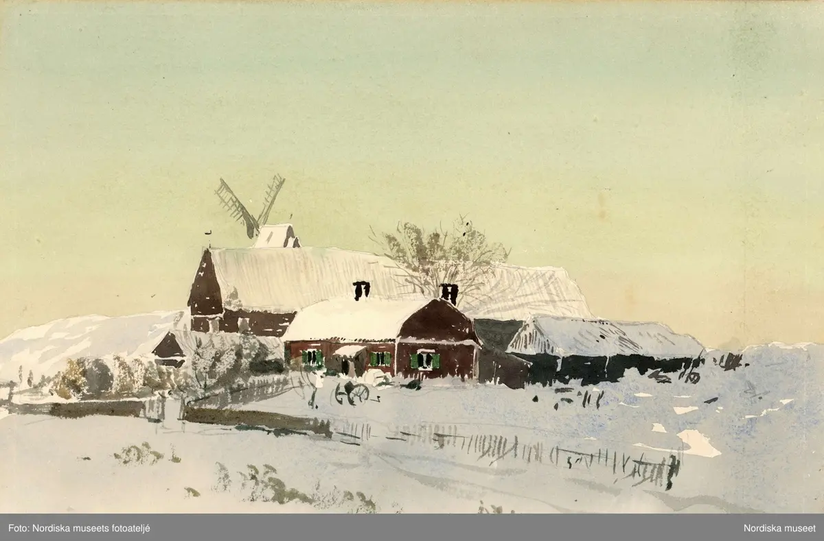 Akvarell av A T Gellerstedt. Vinterlandskap med byggnader och kvarn. Signerad 30/12 77 A.T.G.