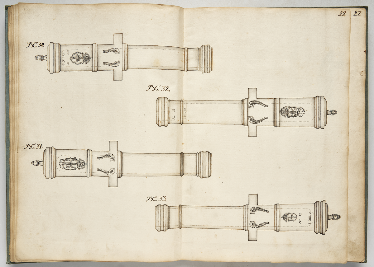 Avbildning av eldrör från fästningen i Riga, ur en volym som dokumenterar artilleritroféer i Livlands fästningar, daterad 1681.