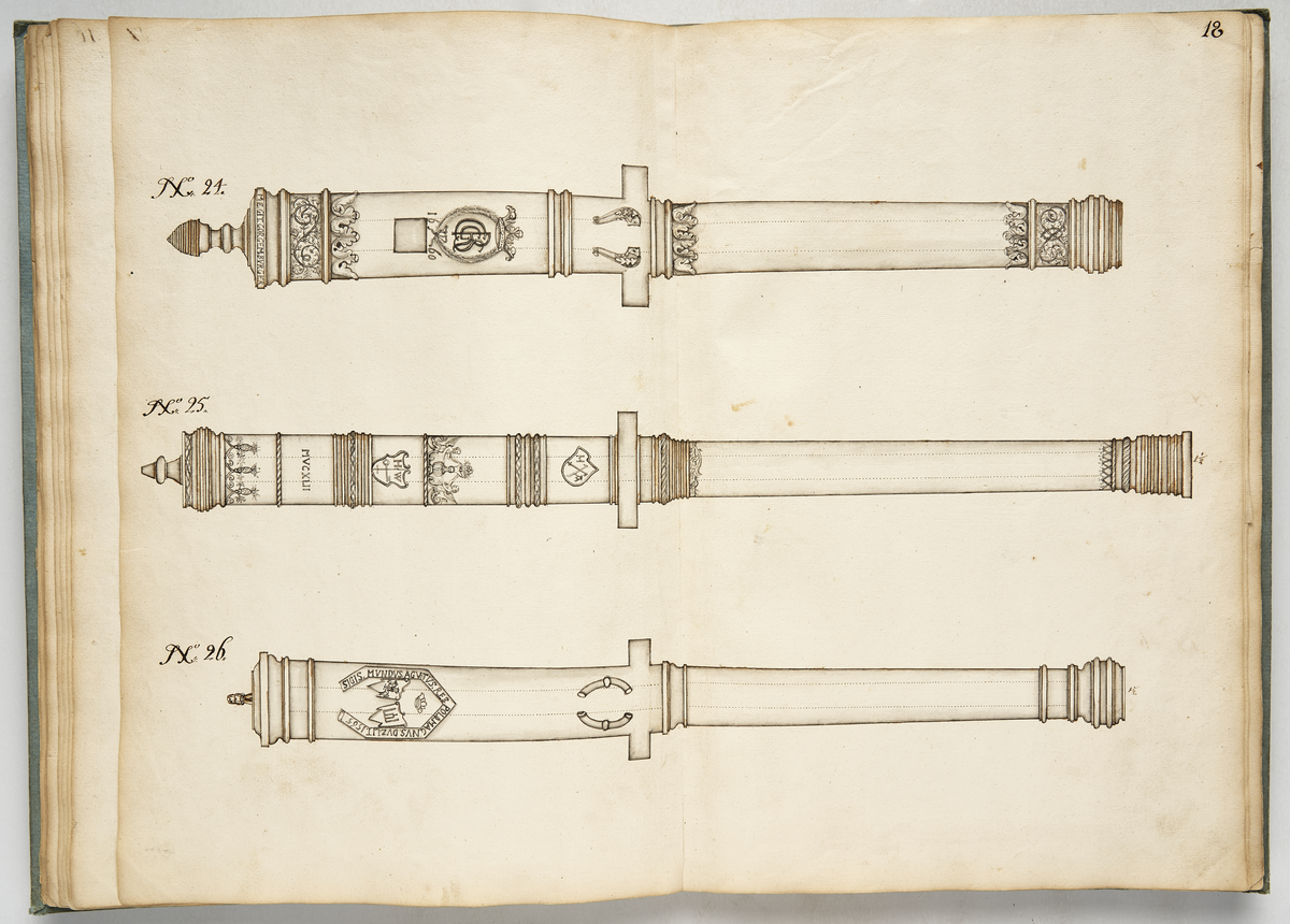 Avbildning av eldrör från fästningen i Riga, ur en volym som dokumenterar artilleritroféer i Livlands fästningar, daterad 1681.