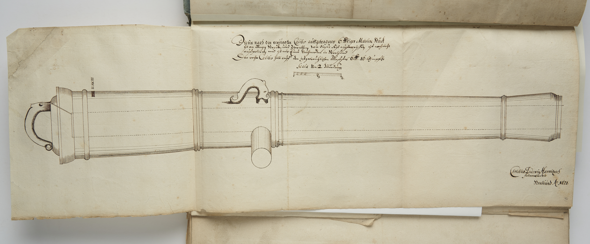 Ritning av eldrör från Stralsund ur en volym som visar troféer och ett mindre antal äldre svenska metallstycken. Dessa ingick i bestyckningen i Stralsund 1671 samt i Helsingborg, Malmö och Landskrona.