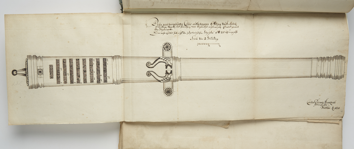 Ritning av eldrör ur en volym som visar troféer och ett mindre antal äldre svenska metallstycken. Dessa ingick i bestyckningen i Stralsund 1671 samt i Helsingborg, Malmö och Landskrona.