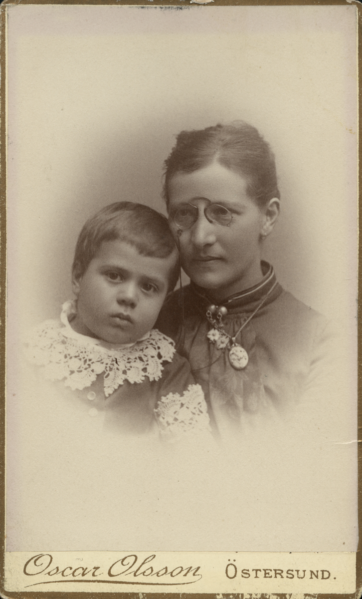 Porträtt av en mamma och hennes son. Text på baksidan: "Till Maria från Olga och Börje Knös, taget d. 12/4-1887."