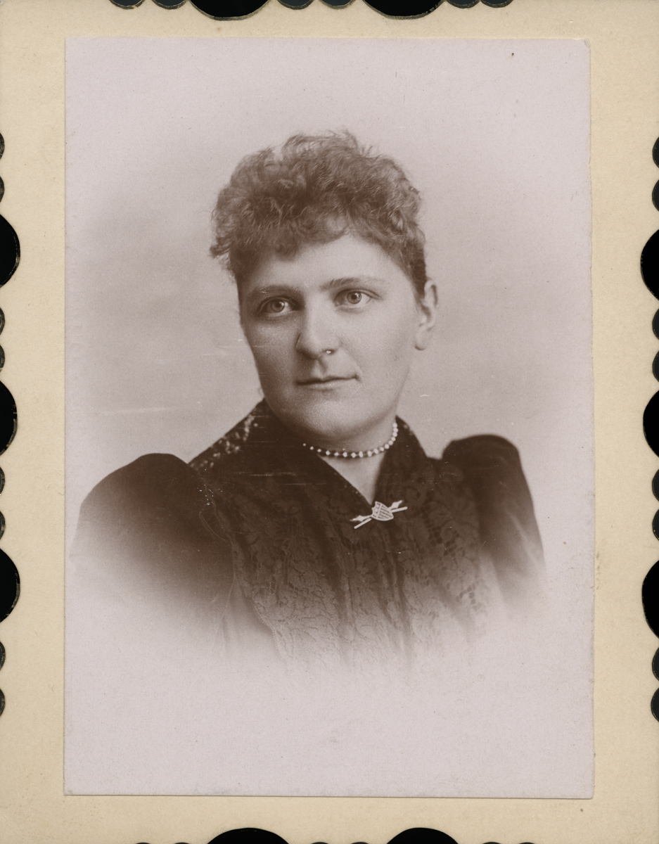 Titel: Porträtt av Tekla Swedlund. Text baksida kort: "Kusin Anna Jönsson-Werner Amerika". Text i högra hörnet: "Teckla".