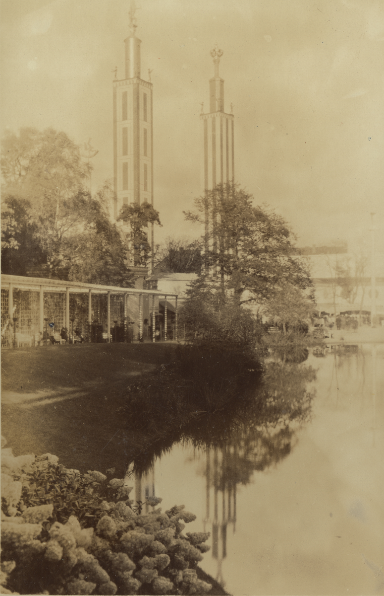 Jubileumsutställningen i Göteborg 1923. Konditori vid Näckrosdammen. Vy mot minareterna Lejonet och Kronan. Ur albumet Utställningen Göteborg 1923.