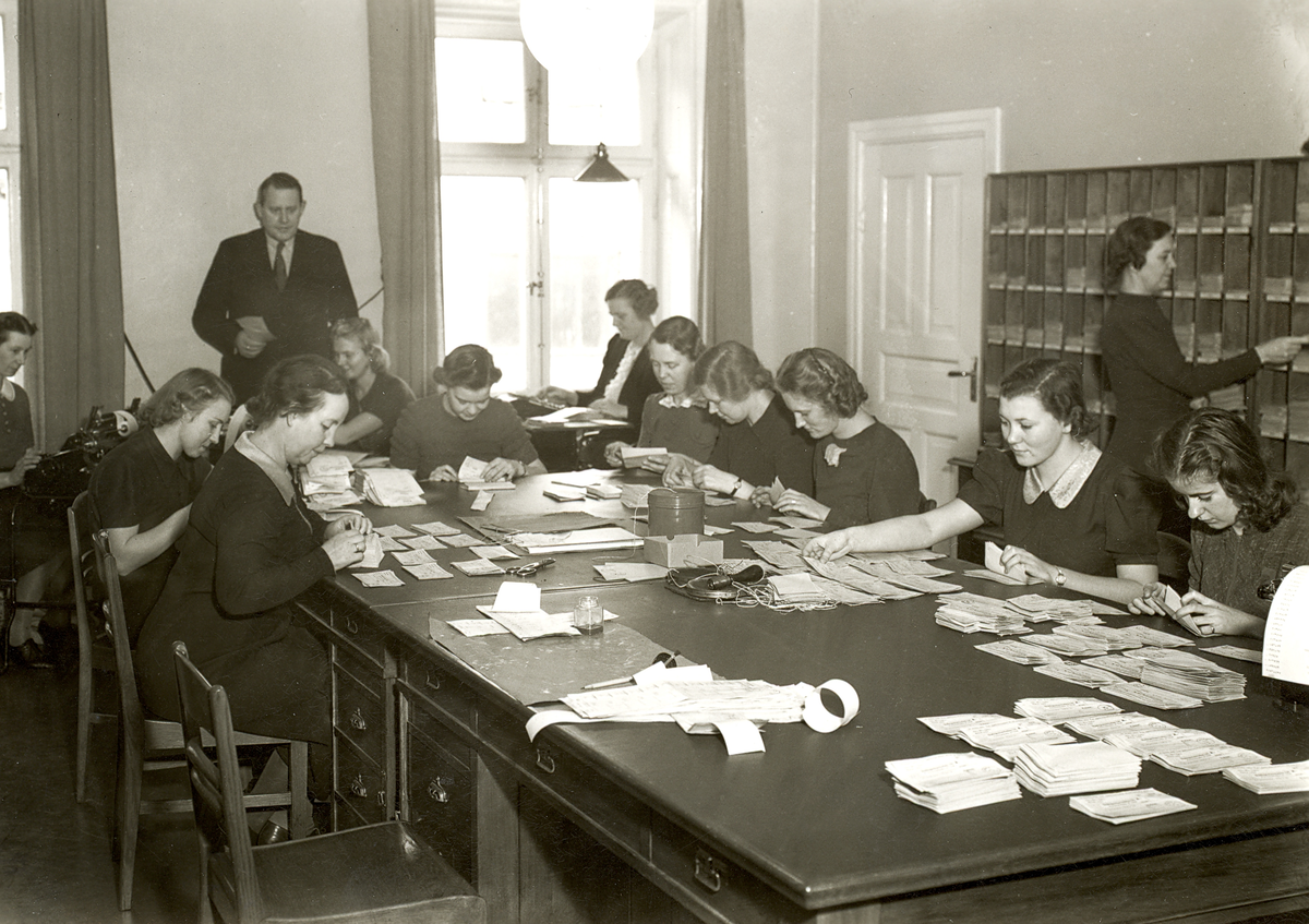 Sortering av ransoneringskort och skattsedlar på postkontoret i Kalmar. 1940-talet.