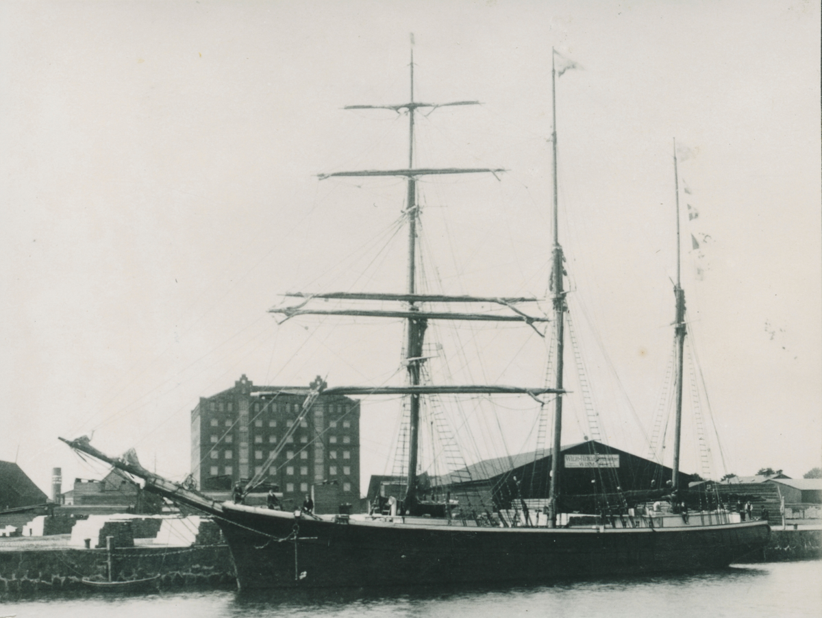 En tremastad skonert ligger förtöjd i hamnen.