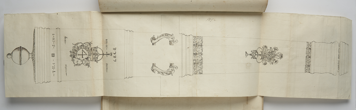 Titel: Ritning av eldrör ur en volym som visar troféer och ett mindre antal äldre svenska metallstycken. Dessa ingick i bestyckningen i Stralsund 1671 samt i Helsingborg, Malmö och Landskrona.