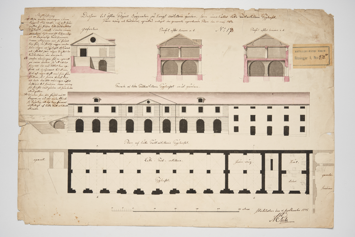 Ritning för plan och fasad för Stora tyghuset i Artillerigården.