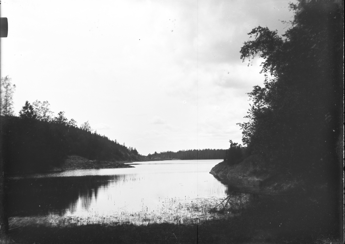 Norra änden av Långtjärn, i folkmun "Skiffertjärn". Till vänster ser man skrothögarna efter skifferbrytningen och i änden av tjärnet ligger torpet "Plan".