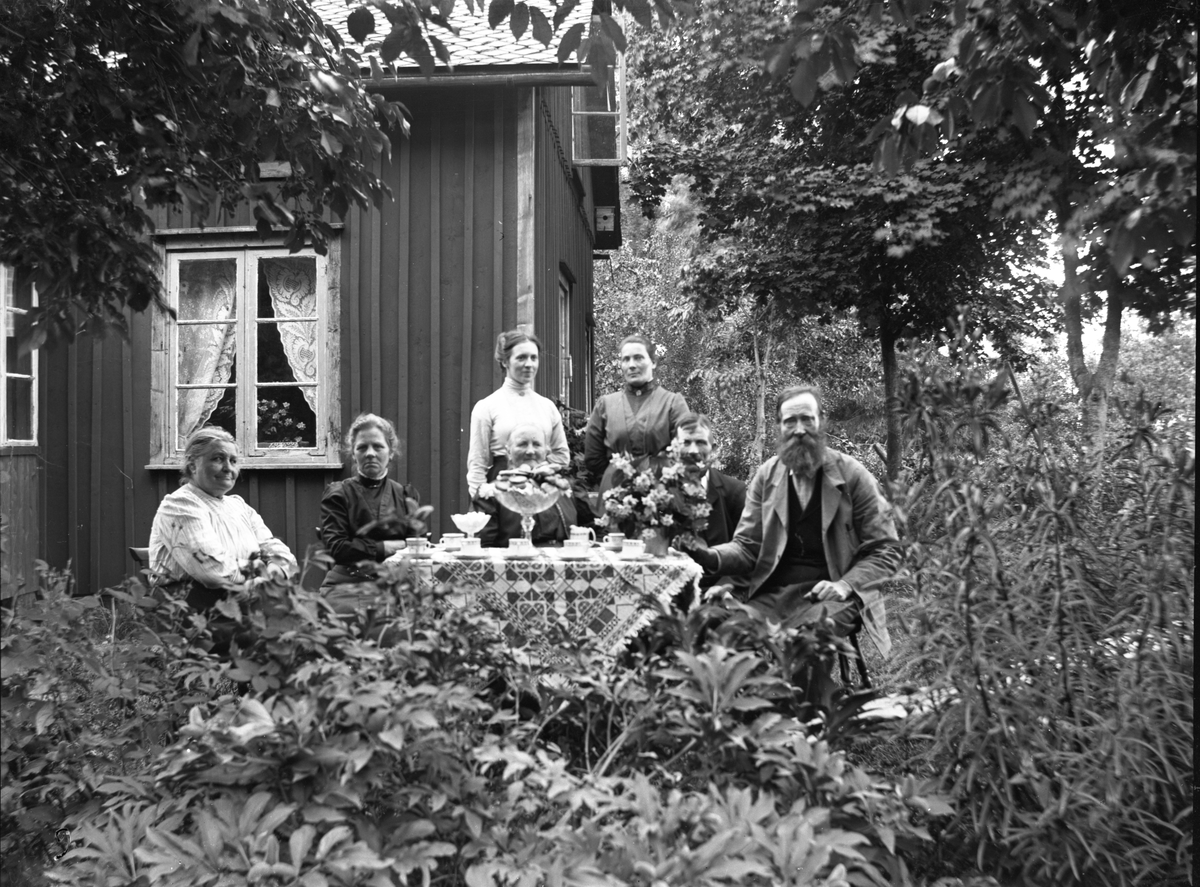 Titel: Dals Rostock. Sällskap vid dukat bord. Längst till vänster sitter Kristina Fält, längst till höger sitter August Fält