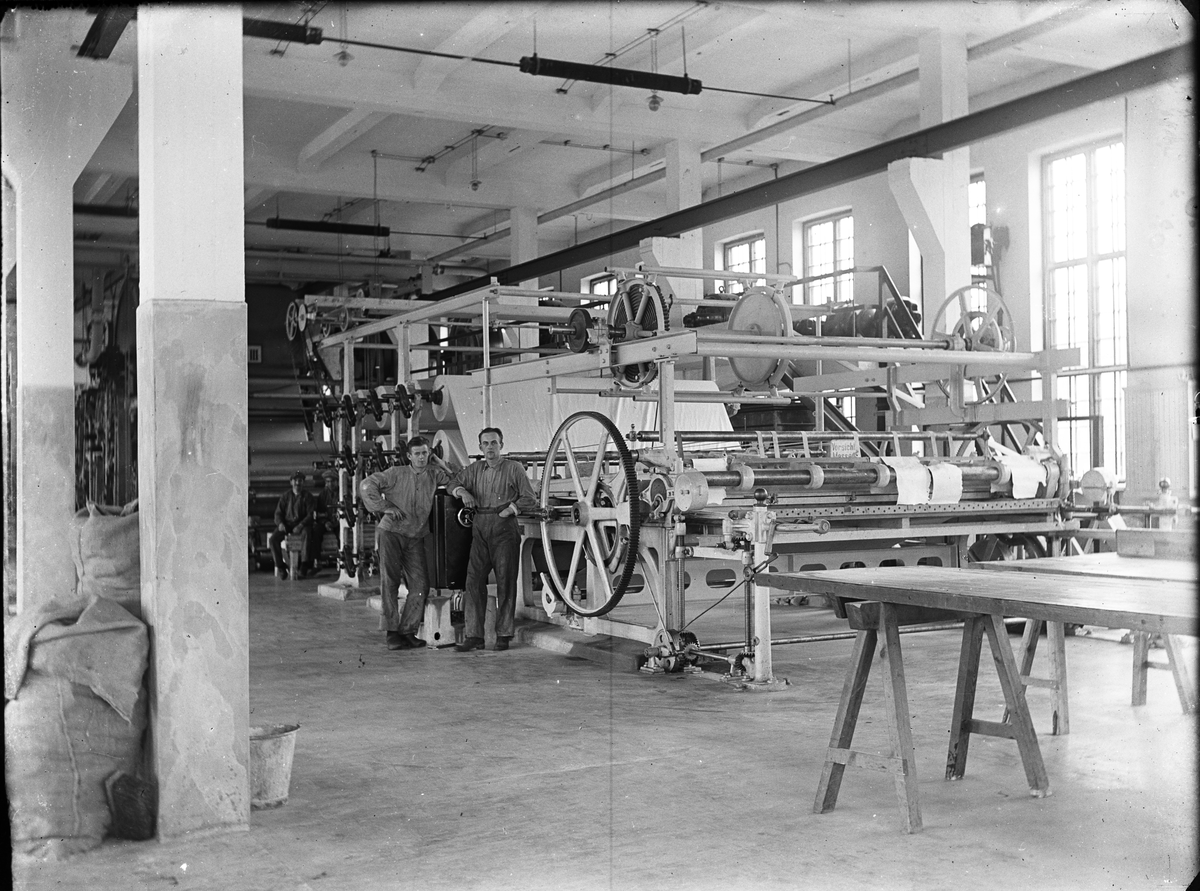 Håfreströms pappersbruk i Åsensbruk. Troligen skärmaskin. I bakgrunden PM3