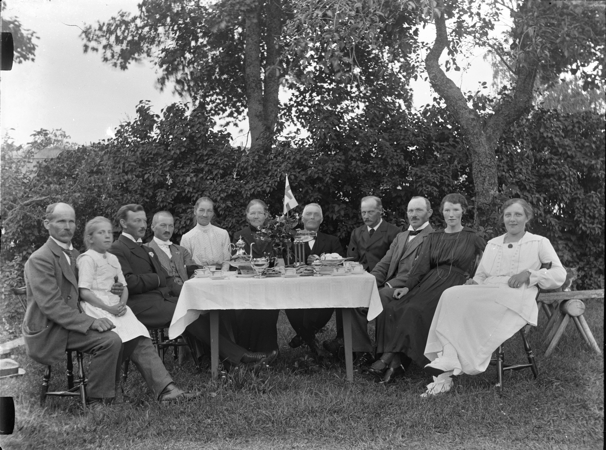 Dals Rostock. Grupp med okända personer dricker kaffe i trädgården.