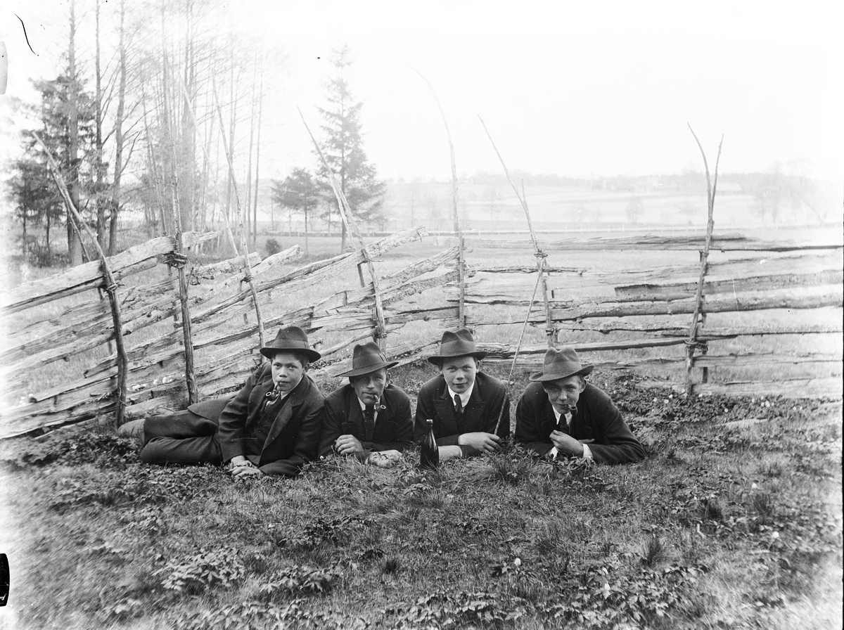 Titel: Fyra yngre män ligger i gräset framför en skigård. I bakgrunden en sjö och gårdar