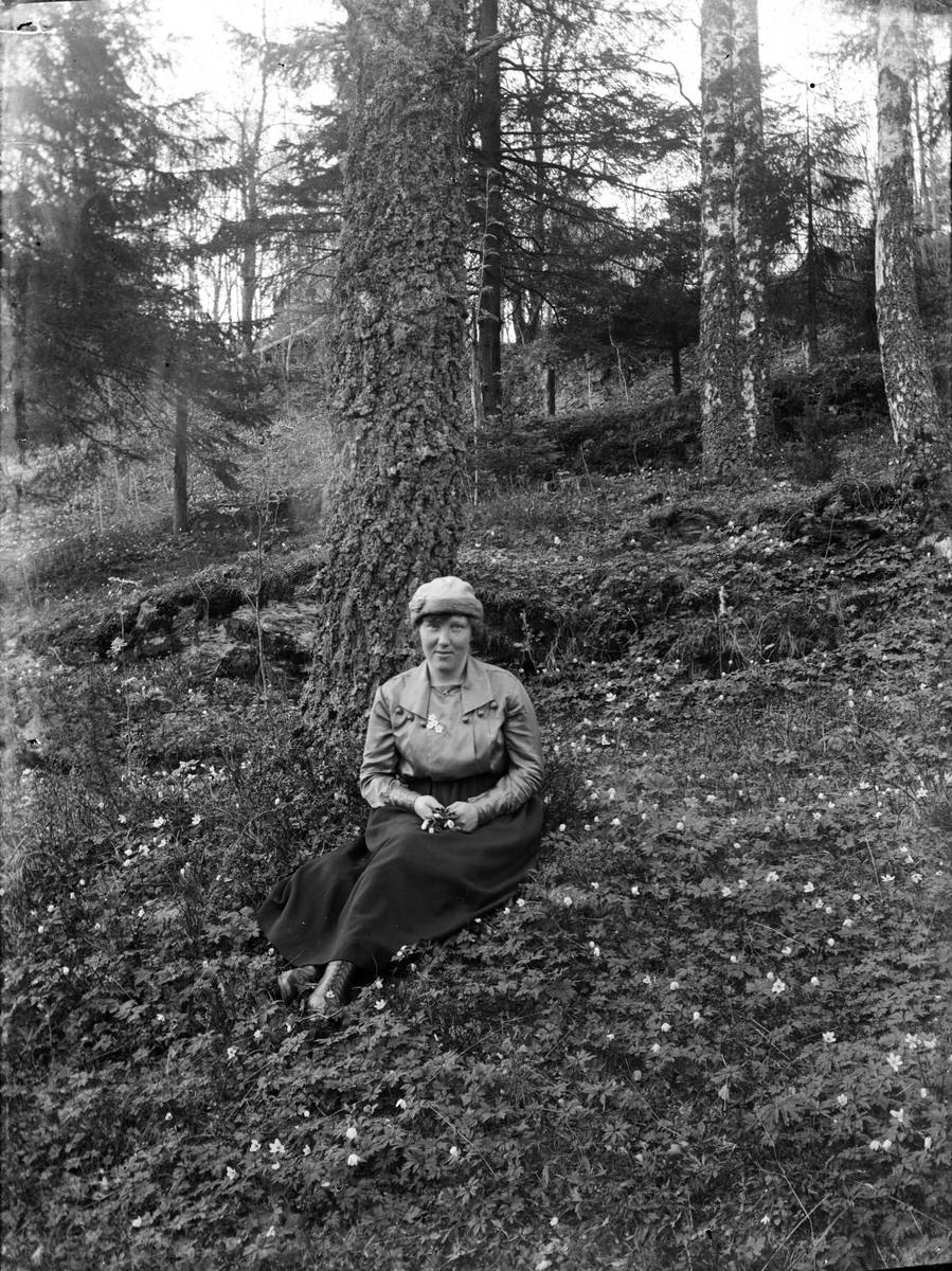 Dals Rostock. Kvinna som sitter i en vitsippebacke