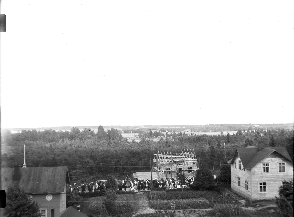 Dals Rostock. Folk med en musikkår i täten på väg, troligen, till Brunnsparken