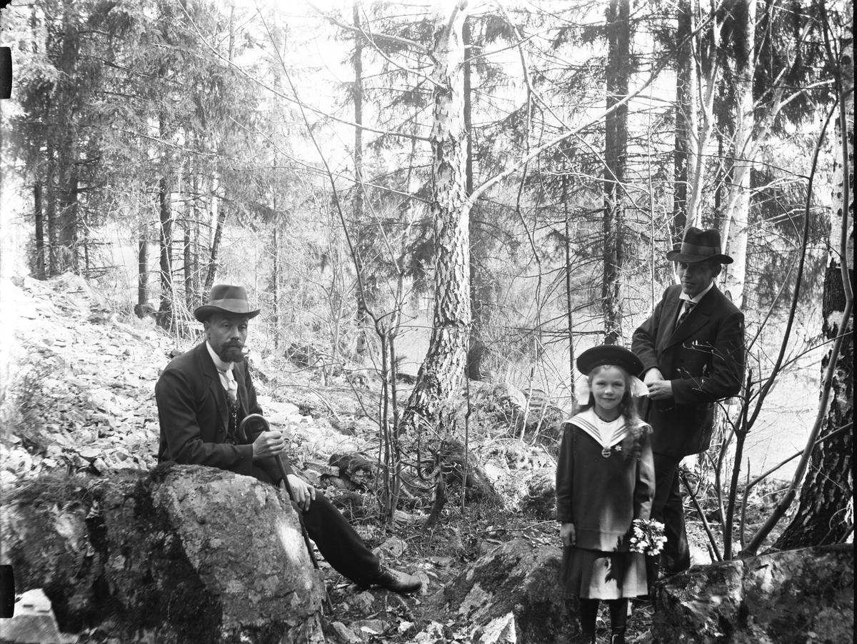 Två män och en flicka. Troligen i skogen strax ovanför Dals Rostock.