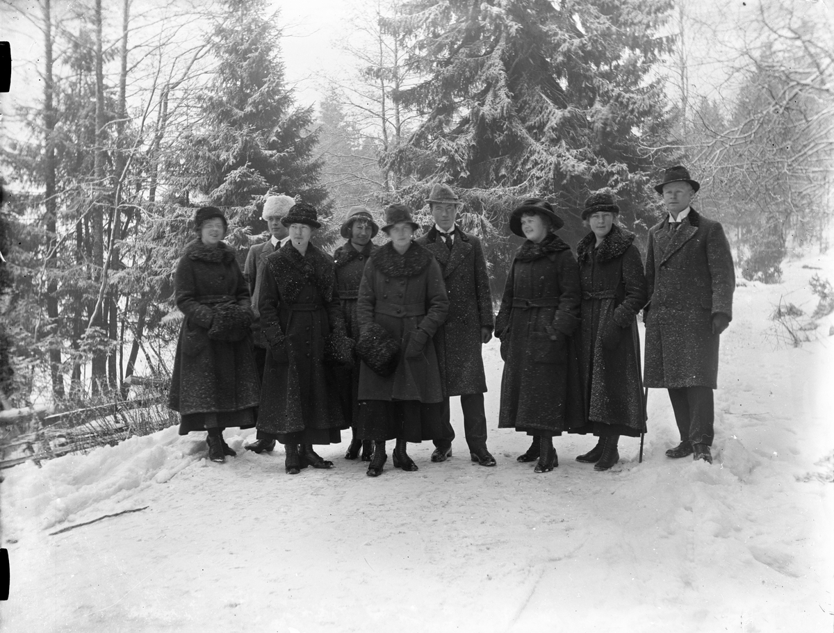 Gruppbild med tre män och sex kvinnor, vinterbild möjligen tagen på Brunnsvägen, Dals Rostock.