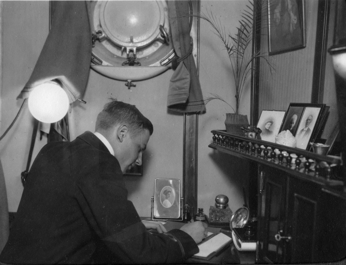 Officer vid skrivbord, fönsterventil i bakgrunden.
