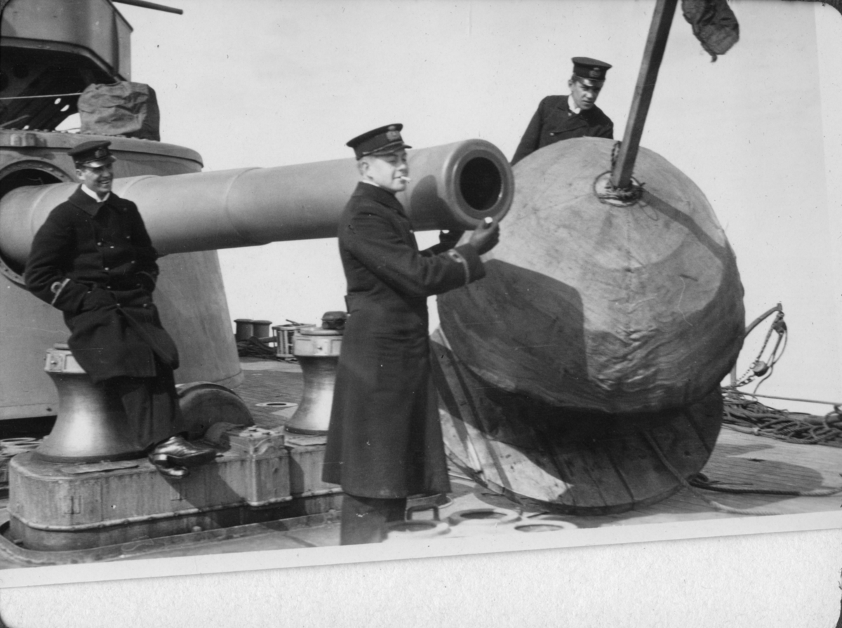 Titel: Officerare vid en kanon sjösätter en boj. Baksidan har text i blyerts "Snälla Grålle får..."