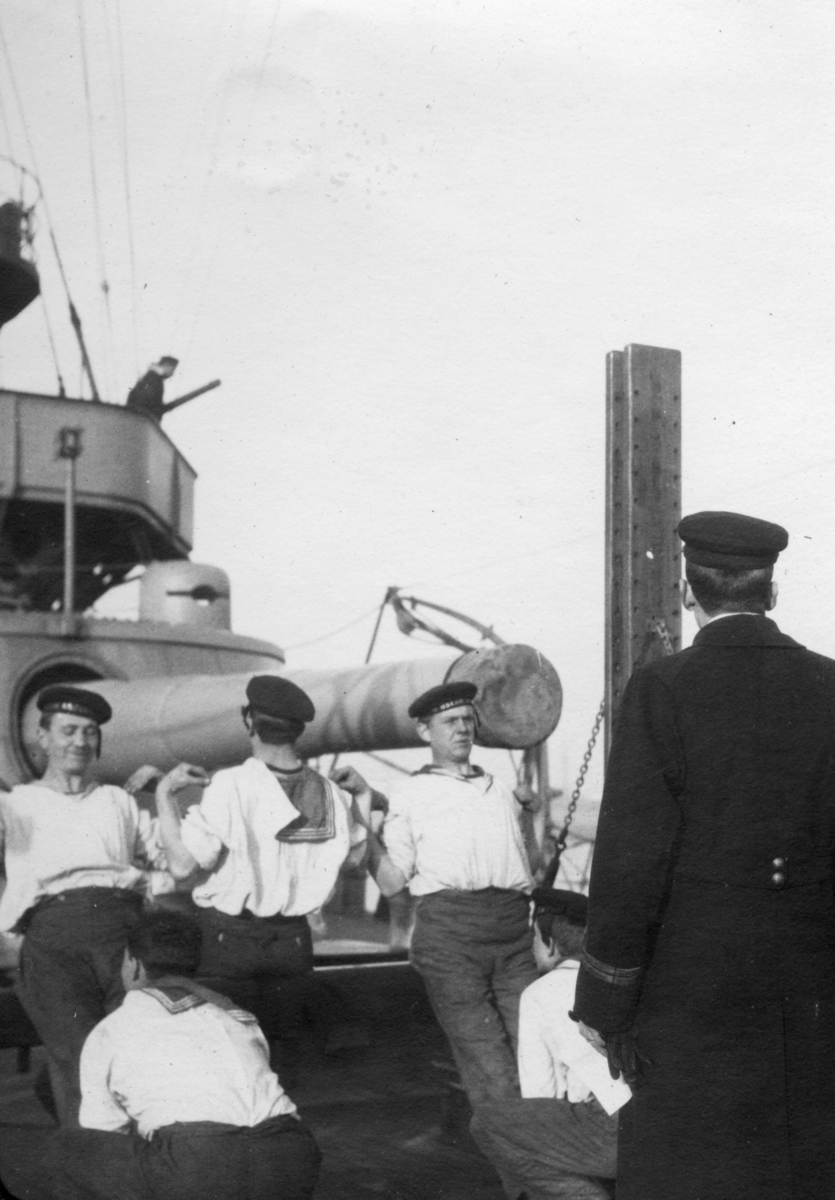 Sjömän gör gymnastik framför en officer. Baksidan har texten "19 24/I 12 Amsterdam får gymnastikuppvisning som aldrig blev av".