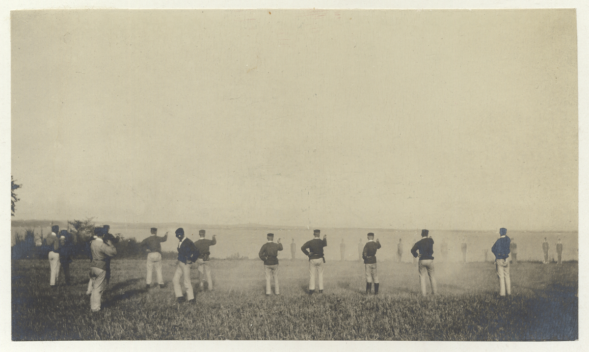 Bilden visar an rad sjökadetter bakifrån som skjuter med pistoler på måltavlor. I bakgrunden syns kustlinjen.