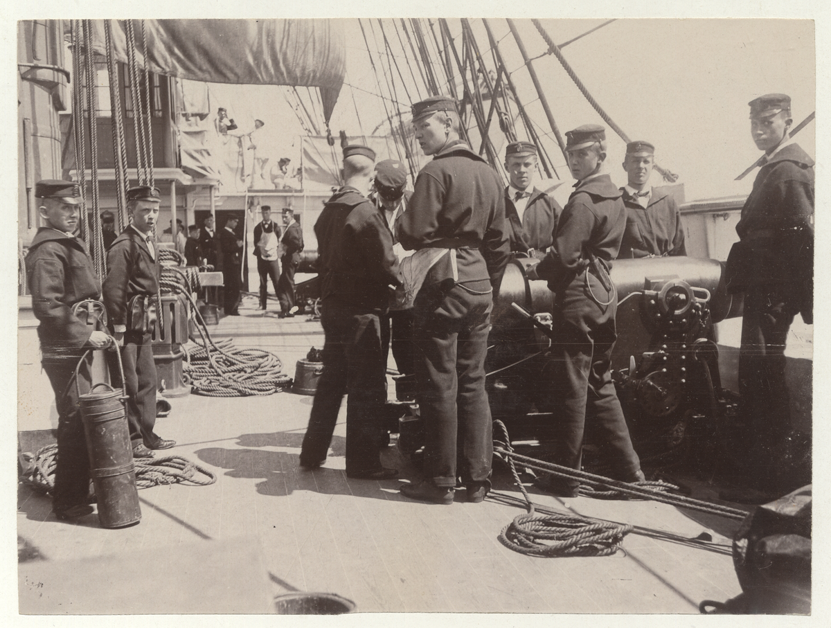 Titel: Bilden visar en grupp sjökadetter som står runt en kanon på däck av korvetten Saga.