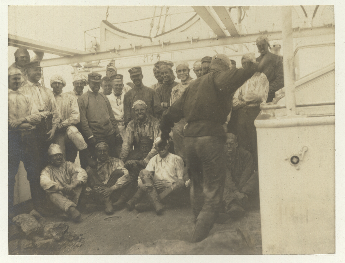 Bilden visar en grupp besättningsmän på Fylgia med smutsiga ansikten och arbetskläder dock på gott humör efter kolningen.